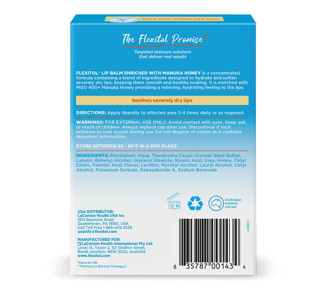 Flexitol Lip Balm enriched with Manuka Honey provides intense hydration and comfort for very dry, chapped lips.